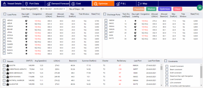 Optimizer window showing the list of load ports and discharge ports, with key parameters, and the list of Time chartered vessels in fleet and spot charter vessels available for hiring as well as a list of constraints that are applied to the optimizer.
