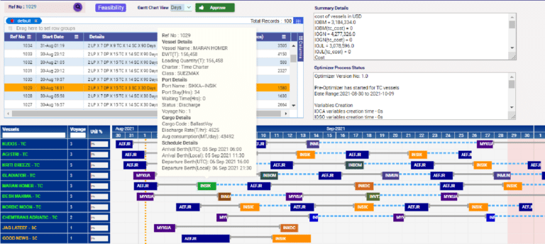 Scheduling indicates the scheduling of vessels to the ports which satisfy the port and vessel constraints, and there is no other team in the oil tanker industry that feels the pressure to optimize scheduling quite as much as the tanker operations teams. They face a herculean task of dealing with demand volatility, pressure to maximize utilization of time charter (TC) vessels, incompatible oil grade loading, finding vessels to spot charter when time charter vessels are fully utilized, and disruptions due to weather, strikes, accidents or unrest.